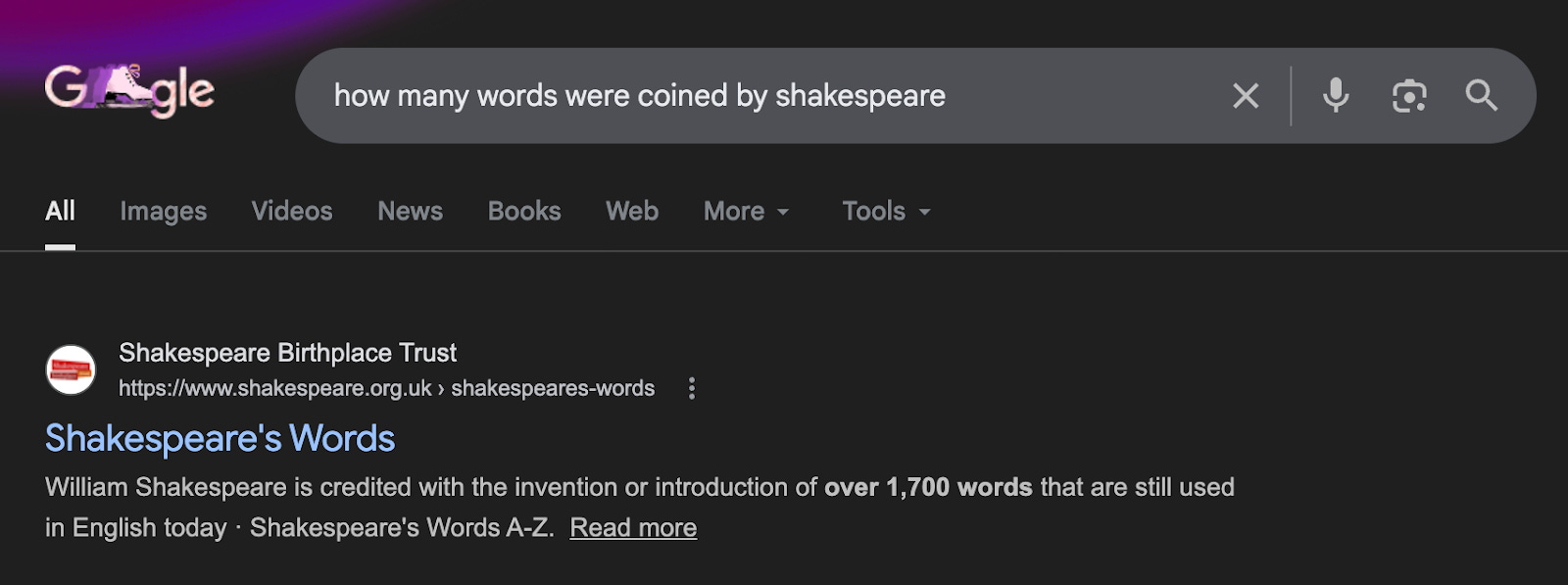 In The Mother Tongue, Bill Bryson states without qualification: Shakespeare “coined some 2,000 words — an astonishing number.”9 Mrs. L’s classroom posters say the same. Google goes with 1,700.